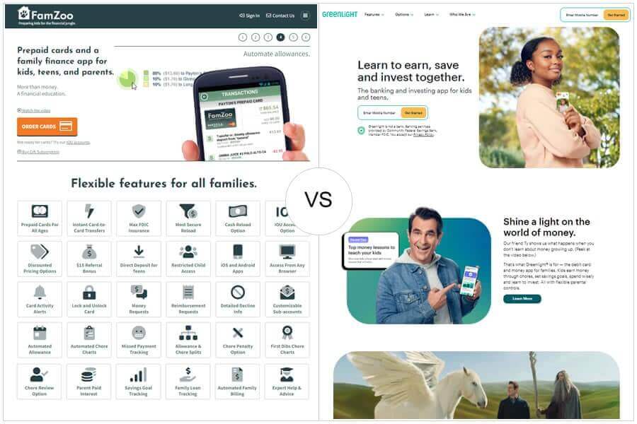 | Products | 1. Famzoo Debit card account 2. Famzoo IOU Account | 1. Base: Debit card + Educational App 2. Base + Invest 3. Greenlight Max (includes Base and Invest) |